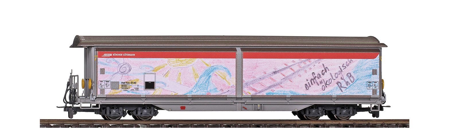 Epoche VI, H0mBeim Bahnfestival 175 Jahre Jubiläum der Schweizer Bahnen wurde während der beiden Ausstellungstage in Landquart ein Zeichenwettbewerb gestartet. Rahel (12), Emma (13) und Nadja (40) haben mit ihren Zeichnungen das Rennen gemacht und einem Güterwagen zu einer neuen weithin auffälligen Gestaltung verholfen. Ihre Interpretationen zum Thema „nachhaltige Transporte“ schmücken nun den Hai-tvz 5140 „Bündner Güterbahn“.