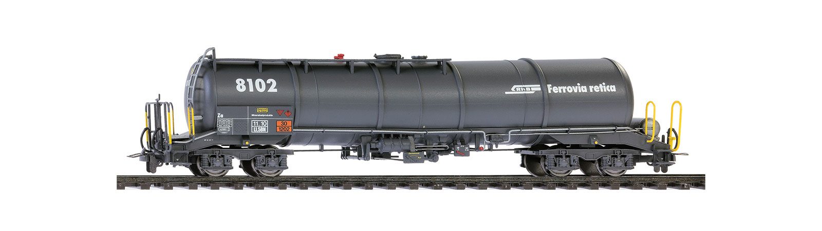 Mit der Produktion der neu lackierten MGB-Wagen nehmen wir zwei Knickkesselwagen der RhB mit neuen Betriebsnummern ins Sortiment: Za 8112 mit blattgefederten Drehgestellen, Za 8103 mit neuerer Drehgestell-Bauform.
