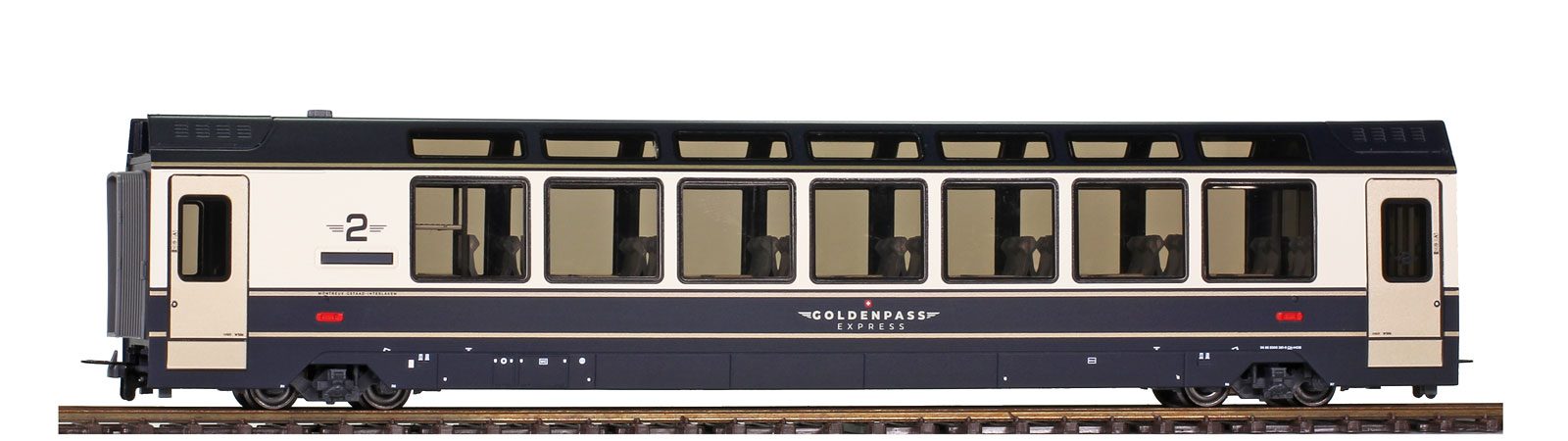 Steuerwagen mit Spitzen-, stirnseitiger Zugziel-, Führerstands- und LED-Innenbeleuchtung sowie Digitalschnittstelle Next18 (NEM 662) und stirnseitigen Teilen zur vorbildgetreuen optischen Aufwertung, falls keine Modellkupplung benötigt wird. Die neun Drehsitze der Prestige Klasse können in beide Fahrtrichtungen montiert werden. Die Wagen As, Bs und Bsi sind für eine optional erhältliche Innenbeleuchtung vorbereitet.