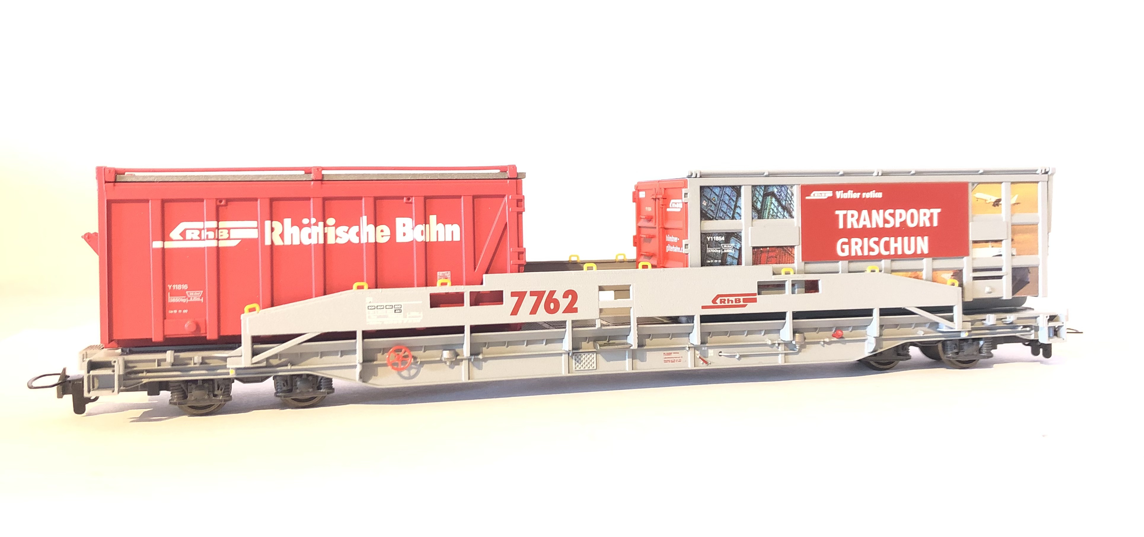 RhB Sl 7762 ACTS-Tragwagen mit RhB + "Bünder Güterbahn"