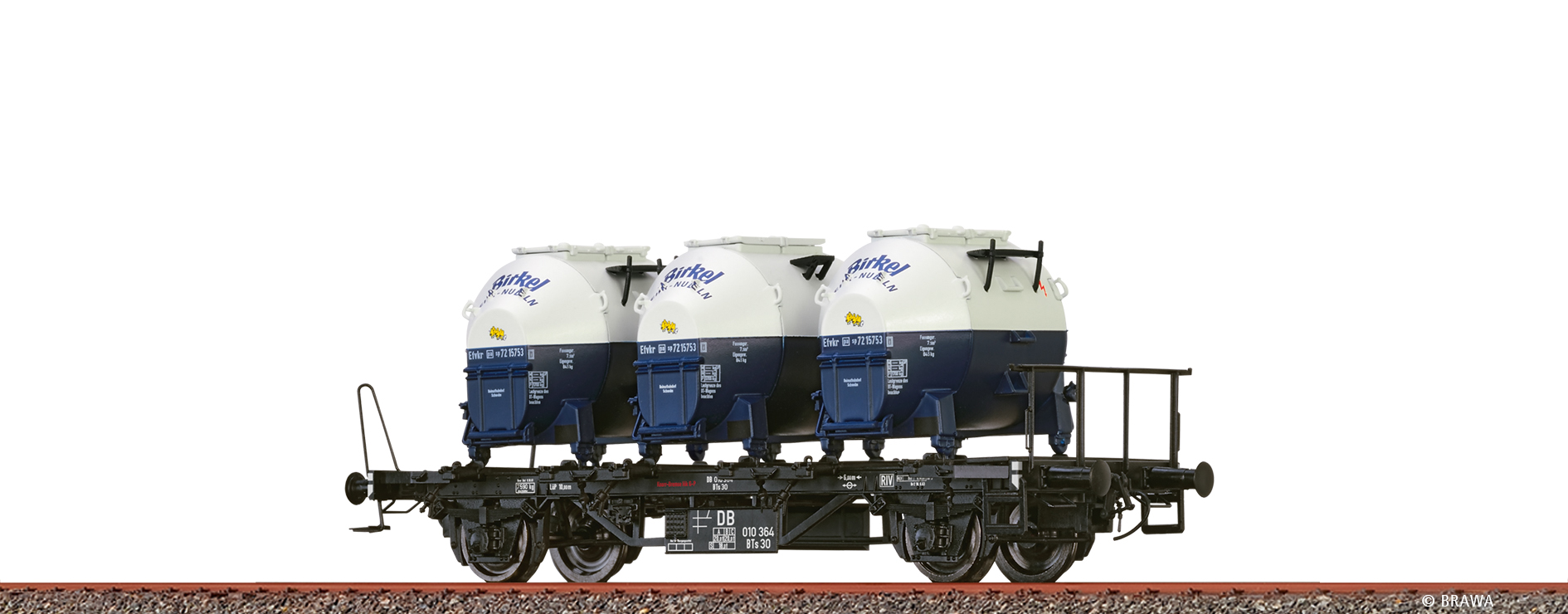 Startseite » Hersteller » BRAWA » BRAWA Aktionen » BRAWA 50598 - Behältertragwagen BTs 30 der DB, mit Efkr401 "Birkel", Ep. III