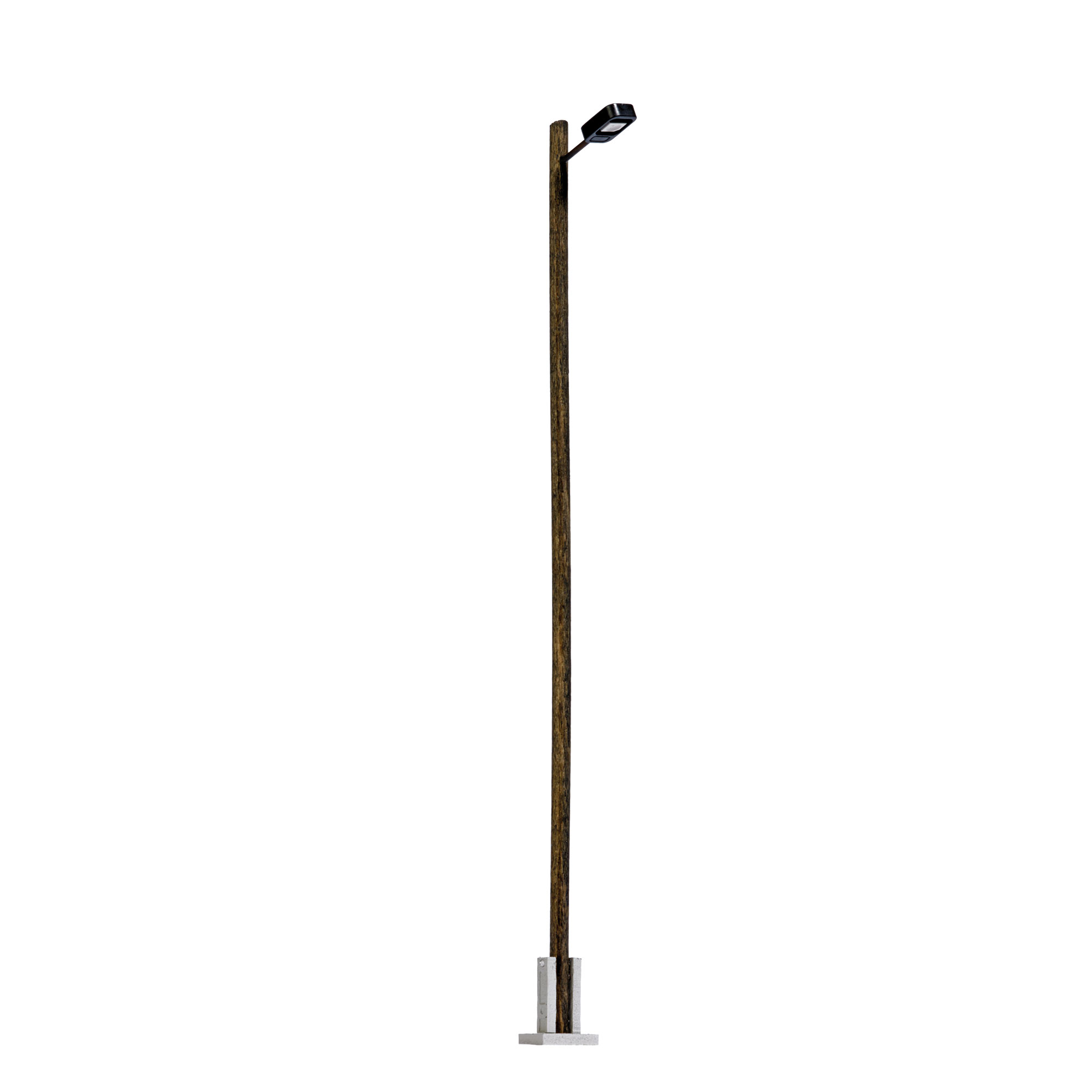 Universell einsetzbare Bahnhofsleuchte mit Mast aus echtem Holz. Auch für Industriegelände geeignet. Nachbildung der Betoneinfassung am Fuß der Lampe.