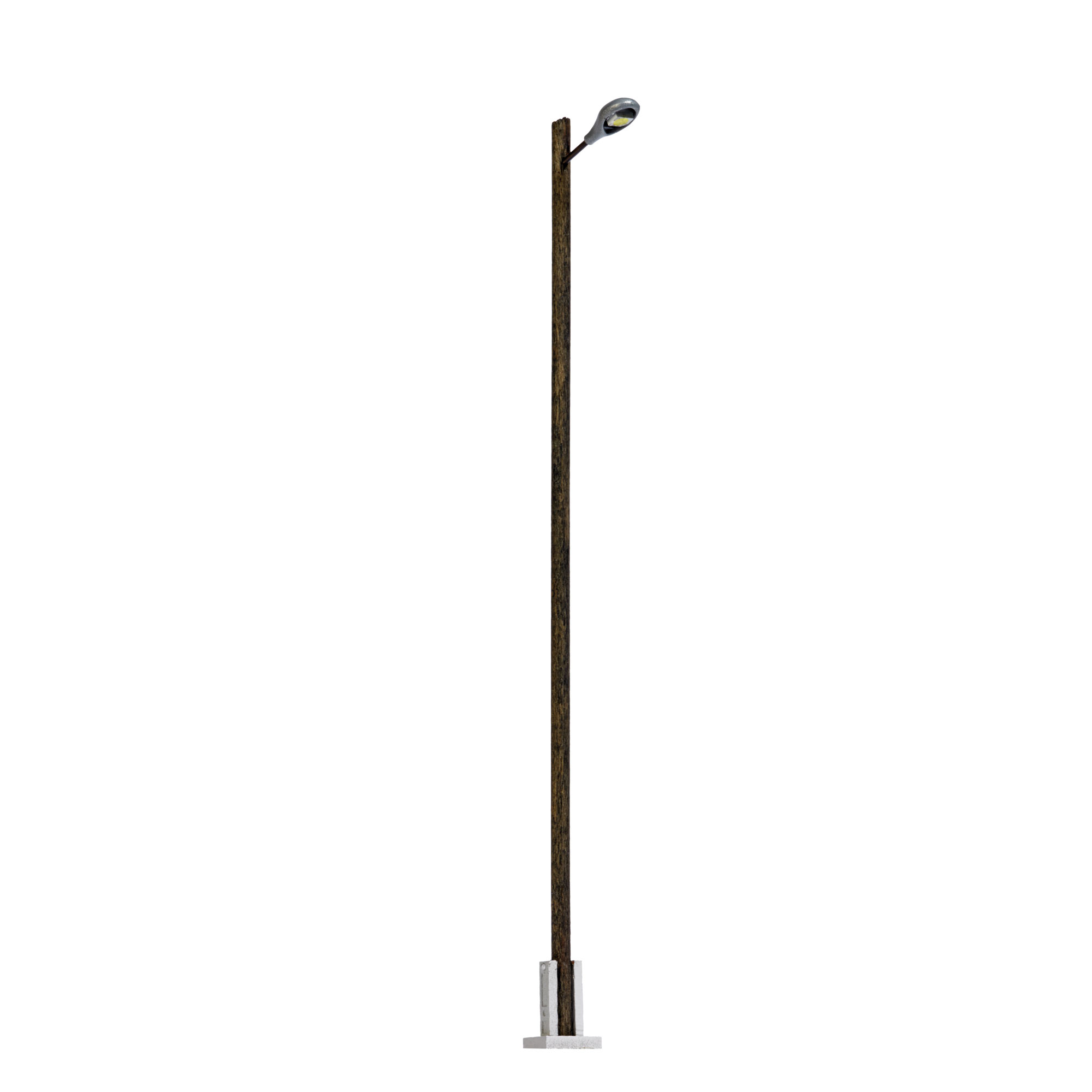 Universell einsetzbare Bahnhofsleuchte mit Mast aus echtem Holz. Auch für Industriegelände geeignet. Mit filigranem Lampenfuß aus Metall. Die ovale Leuchtenform stellt das Modell einer häufig eingesetzten Leuchtentype aus der Fertigung des ehemaligen VEB Leuchtenbau Leipzig (LBL) dar.