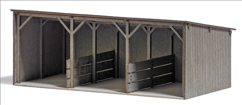 Spur: TTEinseitig geöffneter Unterstand für landwirtschaftliche Fahrzeuge und Zubehör auf einem Feld oder Weide. Auch als Bootswerkstatt an einem See u.v.m. geeignet. Echt-Holz-Bauweise mit bereits fertig kolorierten Holzteilen.