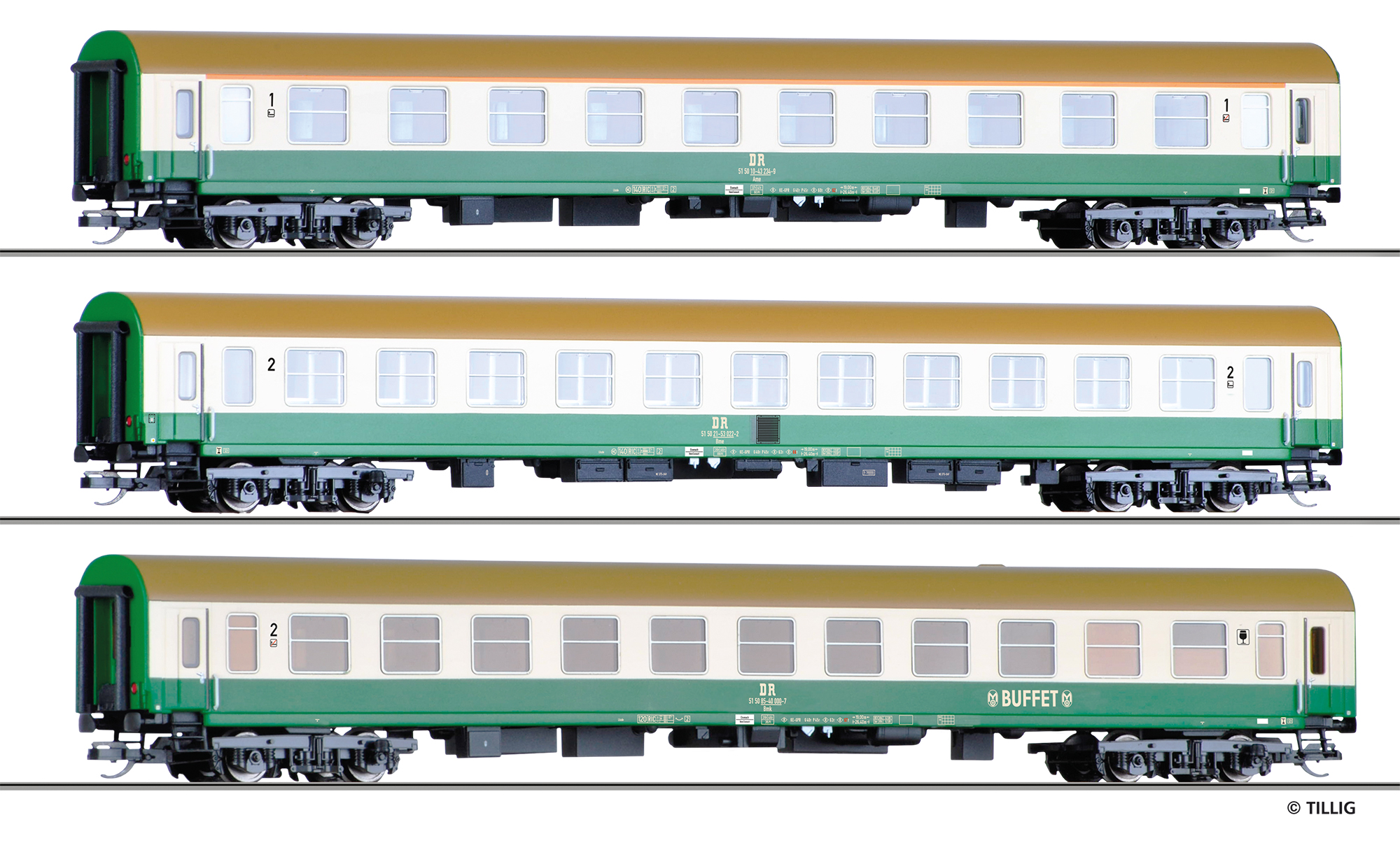 Startseite » Hersteller » TILLIG » TILLIG Spur TT » TILLIG Personenwagen TT » TILLIG 01124 - Reisezugwagenset der DR, Ep. IV