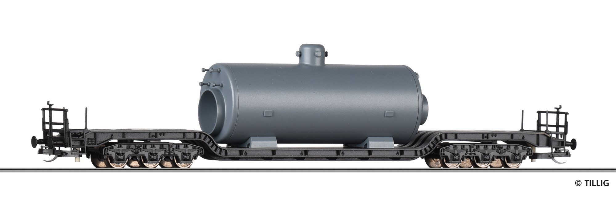 Tiefladewagen SSt 49 der DB, beladen mit Dampfkessel