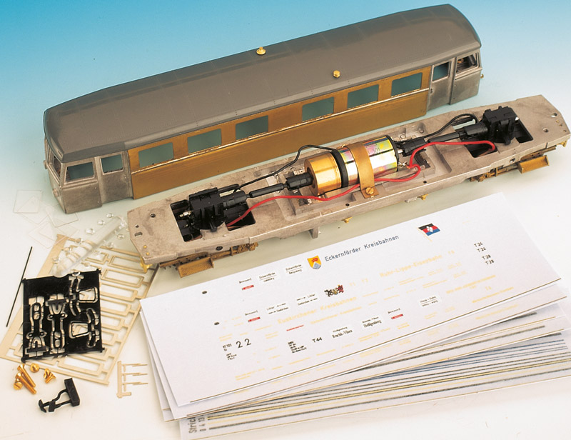 - Bausatzausführung:Messingätzteil(e), Messinggussteil(e), Fenstereinsätze, Faulhaber-Motor, Räder, Achse(n), Beschriftungssatz
