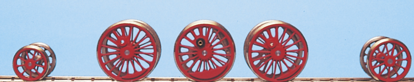 Neusilberguss-Radsätze zur Superung von Serienlokomotiven mit genau dem Vorbild entsprechend nachgebildeten Schwimmhäuten und Gegengewichten. Im Profil RP 25 fertig gedreht, auf Achsen aufgezogen und rot lackiert.